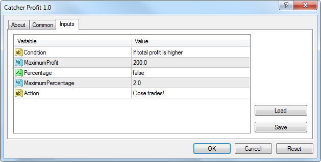 The "Reset" button returns all default settings. Parameters defined in the terminal settings are given in the "Common" tab. And parameters defined in the program source code are set as inputs. To attach the expert with the new parameters to a chart, one has to press "OK". To cancel the expert imposing, one has to press the button of the same name.